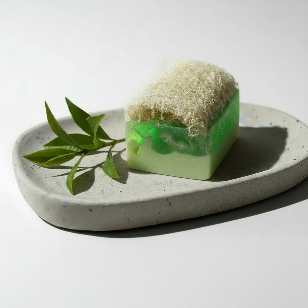 Unsere Verde Calm Luffa-Seife vereint die beruhigende Kraft von Teebaumöl mit der sanften Pflege cremiger Milch.